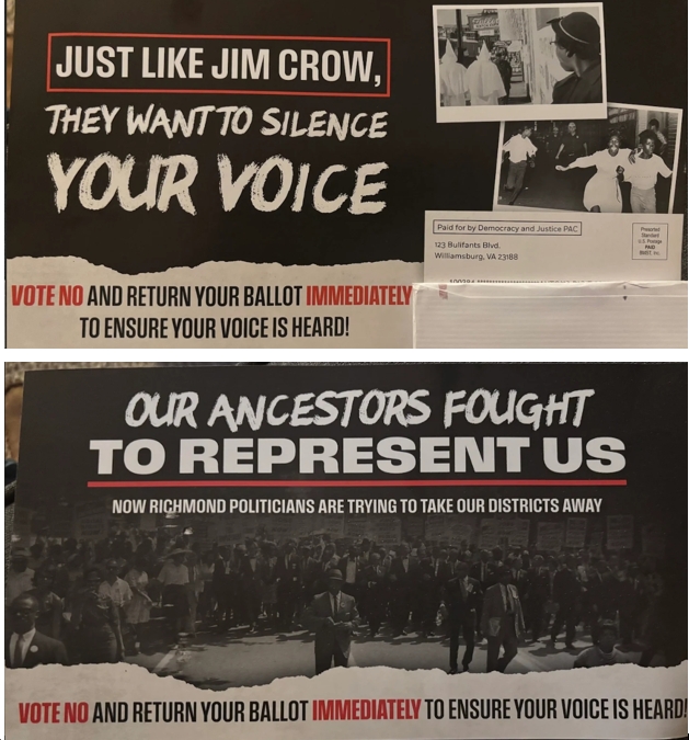 Democrats opposing Virginia's redistricting amendment send out mailers and texts falsely equating the fight against Trump's "assault on democracy" to Jim Crow-era racism - a disgusting smear to scare voters. This desperate tactic comes as the state pushes a constitutional amendment on April 21 to let the Democrat-controlled General Assembly redraw congressional maps mid-decade, giving them an edge in 10 of 11 seats for 2026 midterms. Read more about this...